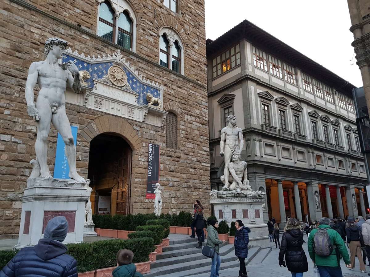 Adeta açık hava heykel müzesi gibi olan meydanın en ünlü heykeli Michelangelo’nun “David” yani Davud heykeli. Heykelin orjinali Galleria del Accademia müzesinde. Neredeyse normal insanın 3 katı büyüklüğündeki heykel 5,17 metre yüksekliğinde.
